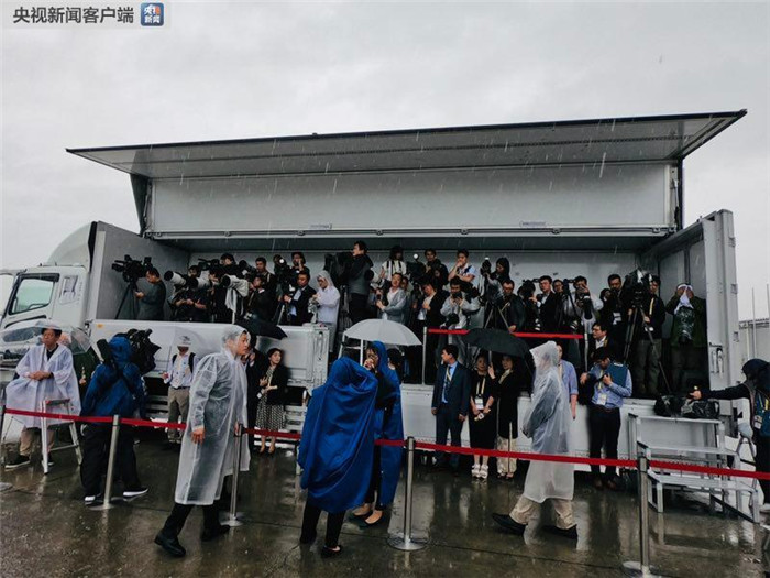 27日上午,大阪,雨。等待報道習近平抵達大阪的記者。