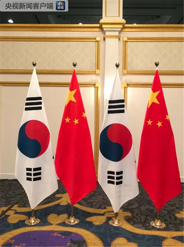 會見現(xiàn)場的中韓兩國國旗(央視記者石偉明拍攝)。