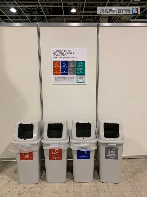 △在G20新聞中心的垃圾桶。大阪將垃圾分為四類:可燃垃圾、易拉罐和玻璃瓶、報紙和雜志、塑料和塑料瓶。