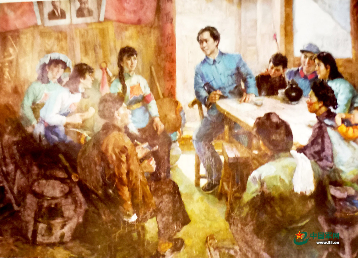 從上面這幅油畫中可以看到當時毛澤東在才溪鄉(xiāng)調查的一些情形。油畫中,一群人坐著大小不一、形式各樣的凳子,圍著毛澤東坐成一圈,其中有老人、婦女、兒童,也有紅軍戰(zhàn)士和青壯年,毛澤東一手拿筆,一手按著紙張,邊傾聽群眾的發(fā)言邊記錄下來。