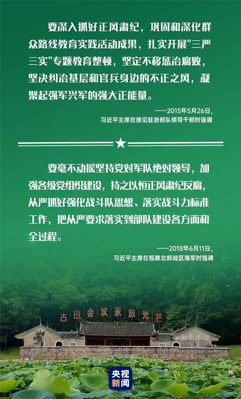 2014年10月,習(xí)近平主席率領(lǐng)400多名軍隊(duì)高級(jí)將領(lǐng)來到古田,召開全軍政治工作會(huì)議,研究解決新的歷史條件下黨從思想上、政治上建設(shè)軍隊(duì)的重大問題。確立新時(shí)代政治建軍方略,引領(lǐng)全軍重整行裝再出發(fā)。