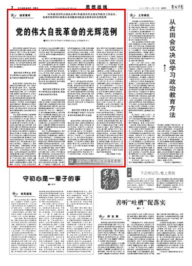 黨的自我革命,就是我們黨糾治自身存在的突出矛盾問(wèn)題,也就是習(xí)主席所指出的,“敢于刀刃向內(nèi),敢于刮骨療傷,敢于壯士斷腕,防止禍起蕭墻”。90年前召開(kāi)的古田會(huì)議和5年前召開(kāi)的古田全軍政治工作會(huì)議,是我們黨和軍隊(duì)聚焦自身問(wèn)題成功推進(jìn)自我革命的光輝范例。把“古田范例”研深悟透、獲得啟迪,對(duì)于我們更好推進(jìn)黨的偉大自我革命,具有重要意義。