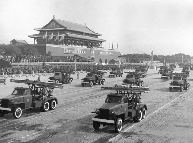 1953年10月1日,中國人民解放軍火箭炮部隊(duì)方陣通過天安門廣場(chǎng)。這是火箭炮兵方隊(duì)第一次出現(xiàn)在受閱隊(duì)伍中。 新華社 圖(資料照片)
