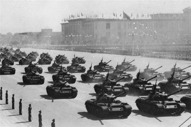 1959年10月1日的國(guó)慶十周年閱兵式上,32輛坦克雄赳赳、氣昂昂駛過(guò)天安門廣場(chǎng)。