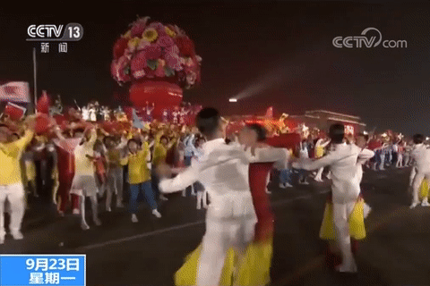夜幕下的天安門廣場(chǎng)燈火輝煌、氣氛熱烈。在雄壯的軍樂聲中,在嘹亮的口號(hào)聲中,在觀眾熱烈的掌聲中,受閱部隊(duì)重點(diǎn)進(jìn)行了閱兵式、分列式演練。隨后,各界群眾游行隊(duì)伍依次走過,全裝彩車首次亮相,處處洋溢著歡樂喜慶、昂揚(yáng)奮進(jìn)的精氣神。聯(lián)歡活動(dòng)在22日晚進(jìn)行演練,首次增加煙花部分燃放任務(wù),多個(gè)表演區(qū)塊各具特色又渾然一體,廣場(chǎng)上唱響盛世歡歌。
