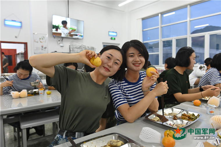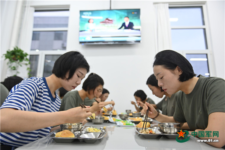 食堂飄出陣陣飯菜香,召喚著女兵去品嘗。隊員們面對記者的攝像機,露出開心的笑容。
