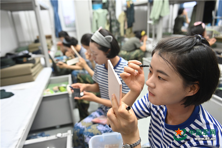 女兵快速化妝補妝。閱兵訓練期間,不管她們以前是否化妝,都需要學會這項技能。方隊統(tǒng)一為隊員采購了性價比高的護扶品、防曬霜和面膜。