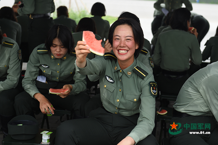 訓練休息間隙加送營養(yǎng)餐。女兵隊員吃到喜愛的水果、酸奶、餅干,眉開眼笑。
