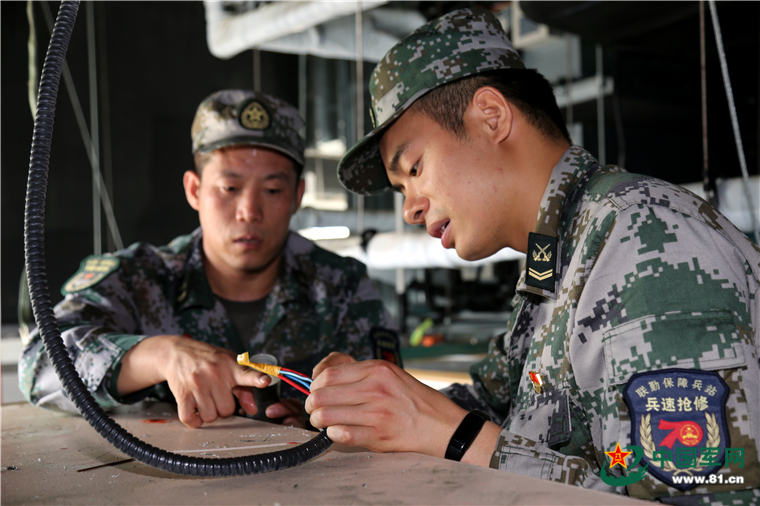 “兵速”搶修的官兵正在維修線路。(谷曉雨 攝)
