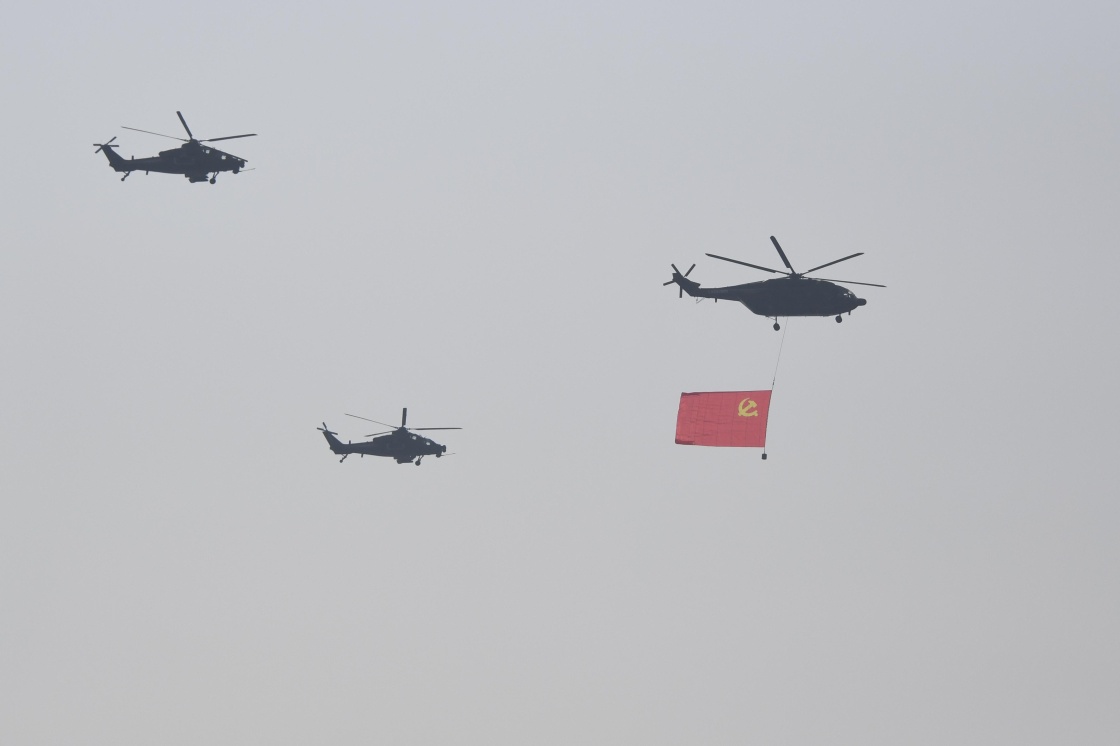 空中護(hù)旗梯隊(duì)由29架直升機(jī)組成。黨旗、國旗分別長(zhǎng)9米、寬6米,軍旗長(zhǎng)7.5米、寬6米,各懸掛在1架直-8B運(yùn)輸直升機(jī)正下方,分別由2架直-10武裝直升機(jī)組成左右僚機(jī)對(duì)其實(shí)施護(hù)衛(wèi),共同組成3組3機(jī)梯隊(duì),呈楔形隊(duì)形依次通過天安門廣場(chǎng)上空。