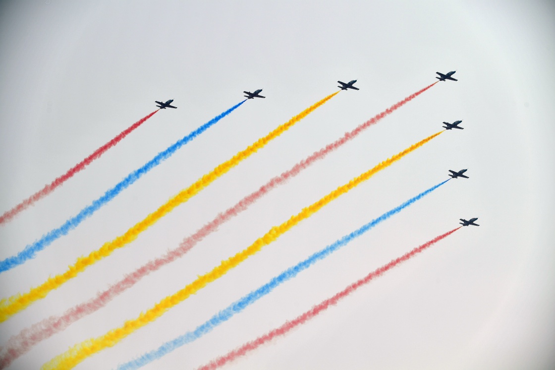 最后,空軍航空大學(xué)“紅鷹”飛行表演隊(duì)的飛行教官們駕駛7架教-8飛機(jī),攜彩煙飛過(guò)天安門廣場(chǎng)上空。7道彩煙輝映長(zhǎng)空,烘托著氣勢(shì)恢宏的空中勁旅,以搏擊空天的凌云壯志,在更高更遠(yuǎn)的航路上振翅高飛。
