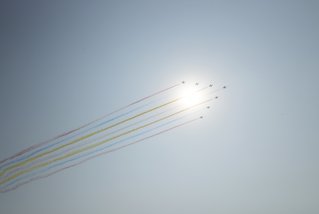 10月1日上午,慶祝中華人民共和國成立70周年大會在北京天安門廣場隆重舉行。這是受閱的教練機梯隊。新華社記者 沈伯韓 攝