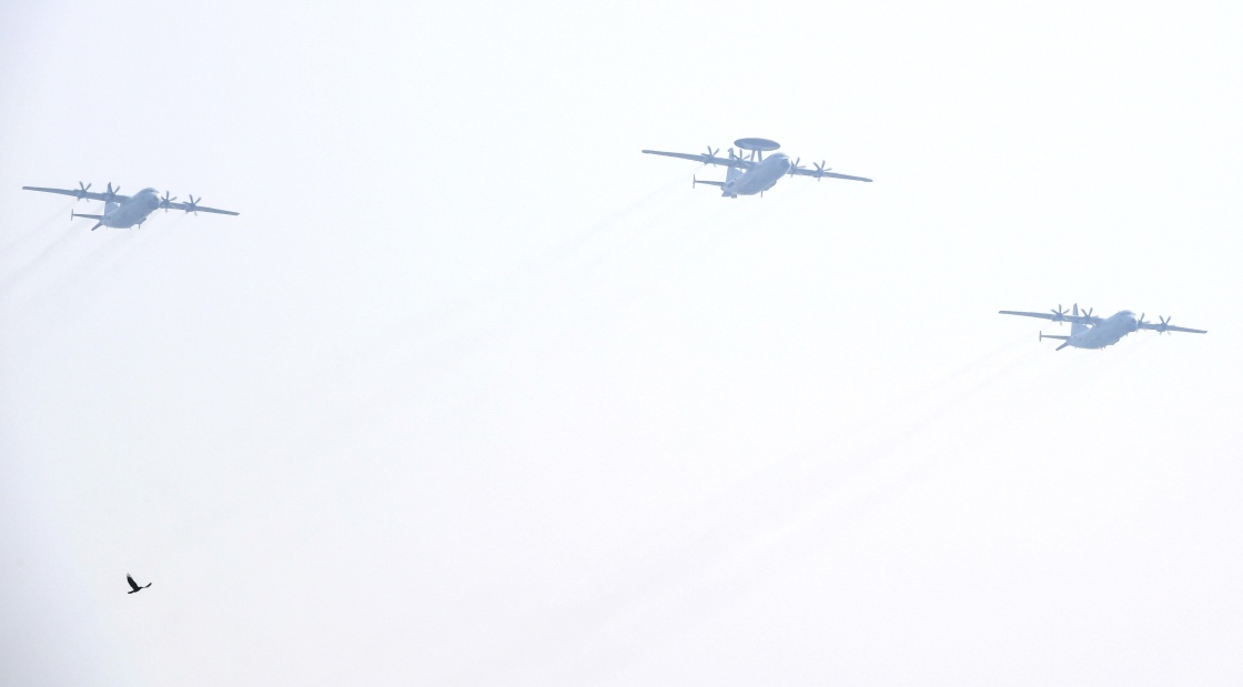 10月1日上午,慶祝中華人民共和國(guó)成立70周年大會(huì)在北京天安門(mén)廣場(chǎng)隆重舉行。這是一只鳥(niǎo)兒從受閱的海上巡邏機(jī)梯隊(duì)下方飛過(guò)。新華社記者 鄧華 攝
