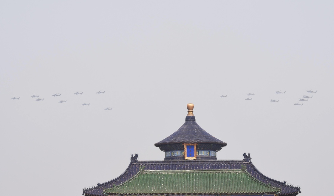 10月1日上午,慶祝中華人民共和國成立70周年大會在北京天安門廣場隆重舉行。這是受閱的陸航突擊梯隊。新華社記者 賀長山 攝