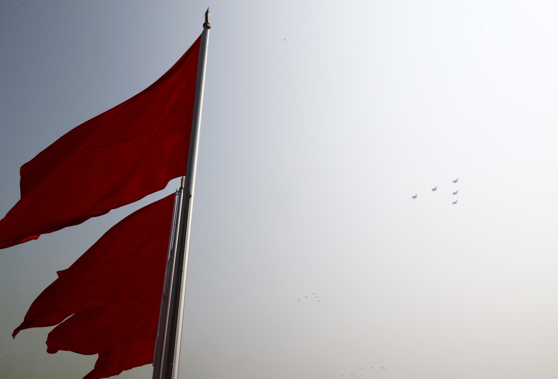 10月1日上午,慶祝中華人民共和國成立70周年大會在北京天安門廣場隆重舉行。這是殲擊機(jī)梯隊(duì)飛過天安門廣場上空。新華社記者 蘭紅光 攝