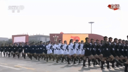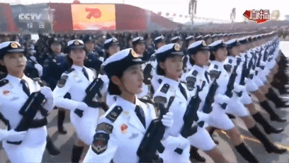 松枝綠、浪花白、天空藍、藏青黃、橄欖綠,在閱兵徒步方隊中,女兵方隊首次以掛槍形式,全新混合編組參加國慶閱兵,成為閱兵中引人注目的五彩方陣。這也是武警部隊女兵首次參加國慶閱兵。