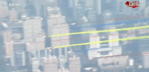 領(lǐng)隊(duì)機(jī)梯隊(duì):七道彩煙為新中國慶祝生日。