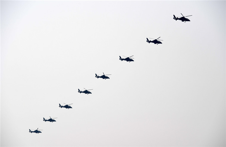 陸航突擊梯隊共分5個模塊,受閱機40架。第一模塊為偵察警戒模塊,由5架直-9直升機組成5機楔形隊形;第二模塊為火力突擊模塊,由9架直-10直升機組成9機楔形隊形;第三模塊為兵力突擊模塊,由3架直-19直升機和6架直-20直升機組成9機品字形隊形;第四模塊為機降突擊模塊,由9架直-8B直升機組成9機品字形隊形;第五模塊為護航模塊,由8架直-19直升機組成一字形隊形。其中,直升機之間最小間距為15米,與地面建筑最小高度差僅50米。