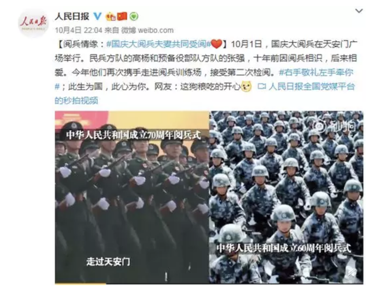 民兵方隊(duì)的高楊和預(yù)備役部隊(duì)方隊(duì)的張強(qiáng),十年前因閱兵相識,后來相愛。今年他們再次攜手走進(jìn)閱兵訓(xùn)練場,接受了第二次檢閱。右手敬禮左手牽你;此生為國,此心為你。網(wǎng)友:這狗糧吃的開心。