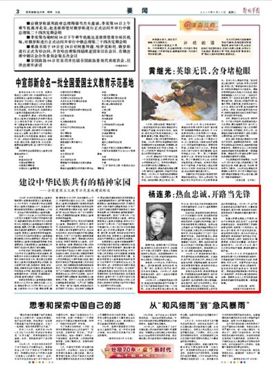 1952年5月15日,時任副連長的楊連弟在清川江大橋指揮連隊架橋時,不幸被敵機投下的炸彈擊中頭部,英勇犧牲,年僅33歲。志愿軍總部為他追記特等功,并追授一級戰(zhàn)斗英雄稱號,他生前所在連隊被命名為“楊連弟連”。原鐵道部將隴海鐵路8號橋命名為“楊連弟橋”,并在橋頭建立楊連弟紀念碑。朝鮮民主主義人民共和國追授楊連弟英雄稱號和金星獎?wù)隆⒁患墖靹渍隆?/p>