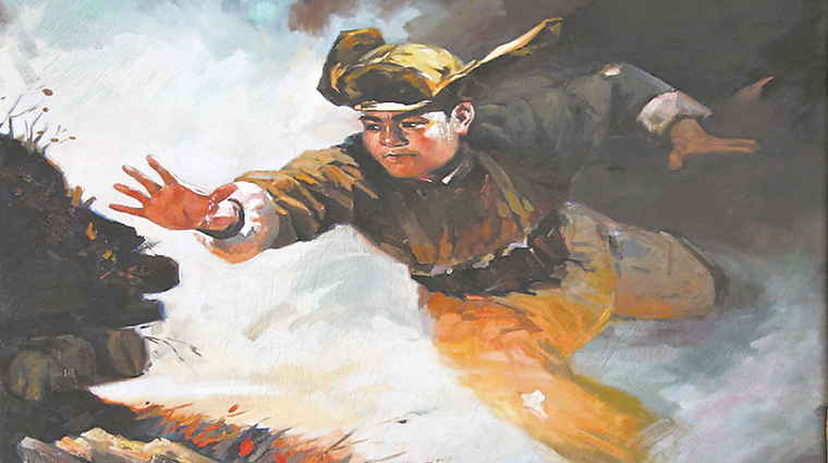 關(guān)鍵時(shí)刻,時(shí)任某部六連通信員的黃繼光挺身而出?!笆组L(zhǎng),讓我去吧!”他掏出早已寫好的決心書交給營(yíng)參謀長(zhǎng)。在決心書上黃繼光寫道:“堅(jiān)決完成上級(jí)交給的一切任務(wù),爭(zhēng)取立功當(dāng)英雄,爭(zhēng)取入黨。”營(yíng)參謀長(zhǎng)轉(zhuǎn)過身沉思片刻,當(dāng)即任命黃繼光為六班班長(zhǎng)。黃繼光帶領(lǐng)兩名戰(zhàn)士向敵火力點(diǎn)前進(jìn),期間連續(xù)摧毀敵人幾個(gè)火力點(diǎn),一名戰(zhàn)友不幸犧牲,另一名戰(zhàn)友身負(fù)重傷,他的左臂也被打穿。面對(duì)敵人的猛烈掃射,他毫不畏懼,忍著傷痛,迅速抵近敵中心火力點(diǎn),連投幾枚手雷,敵機(jī)槍頓時(shí)停止射擊。然而,當(dāng)部隊(duì)趁勢(shì)發(fā)起沖擊時(shí),殘存在地堡里的機(jī)槍又突然開始掃射,攻擊部隊(duì)再次受阻。
