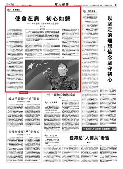 用生命擔(dān)當(dāng)使命的新時(shí)代英雄戰(zhàn)士、“時(shí)代楷?!倍鸥粐南冗M(jìn)事跡,感動(dòng)了億萬人,在軍營內(nèi)外引發(fā)了強(qiáng)烈反響。學(xué)習(xí)杜富國,使我們更加真切看到了新時(shí)代革命軍人的青春榜樣;走近杜富國,使我們更加深切感受到了習(xí)近平強(qiáng)軍思想的實(shí)踐偉力;感悟杜富國,使我們更加懂得了時(shí)代賦予青年一代的使命擔(dān)當(dāng)??梢哉f,杜富國是新時(shí)代革命軍人的杰出代表,他的成長經(jīng)歷和英雄事跡所體現(xiàn)的精神品質(zhì),對于年輕官兵在軍營成長成才具有示范意義。從今天起,解放軍報(bào)《軍人修養(yǎng)》專版以“‘時(shí)代楷?!鸥粐某砷L啟示”為主題推出一組文章,敬請關(guān)注。