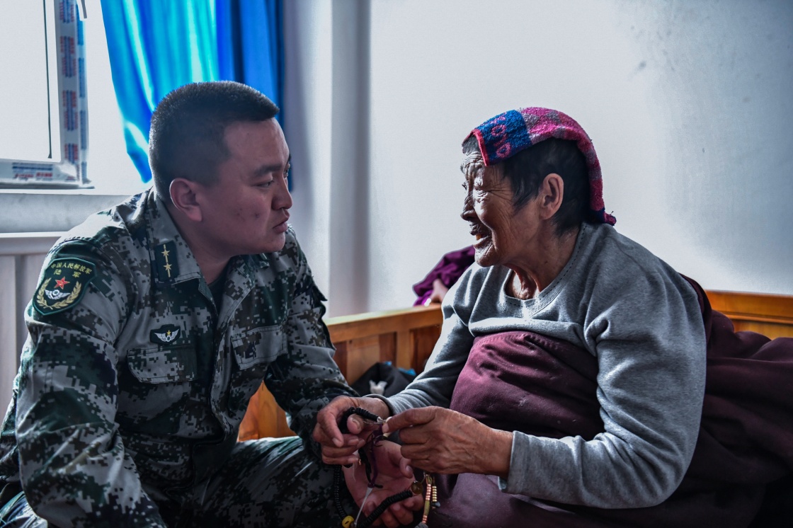 6月8日,西部戰(zhàn)區(qū)陸軍某旅玉樹獨(dú)立騎兵連連長(zhǎng)尼都塔生(左)在玉樹市敬老院看望東周卓瑪老人。新華社記者 張龍 攝