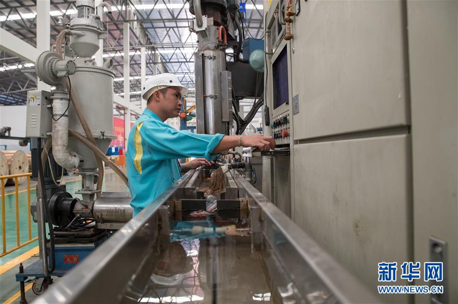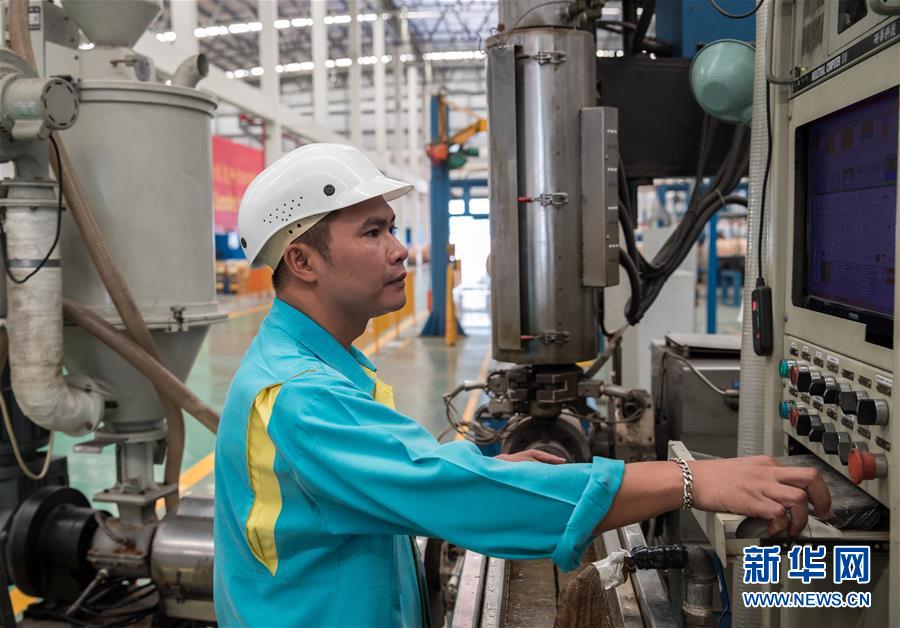 4月1日,在泰國(guó)泰中羅勇工業(yè)園富通集團(tuán)廠區(qū)內(nèi),富通(泰國(guó))生產(chǎn)制造部制造科副科長(zhǎng)、42歲的泰國(guó)人沙克在流水線上操作設(shè)備。新華社記者 張可任攝