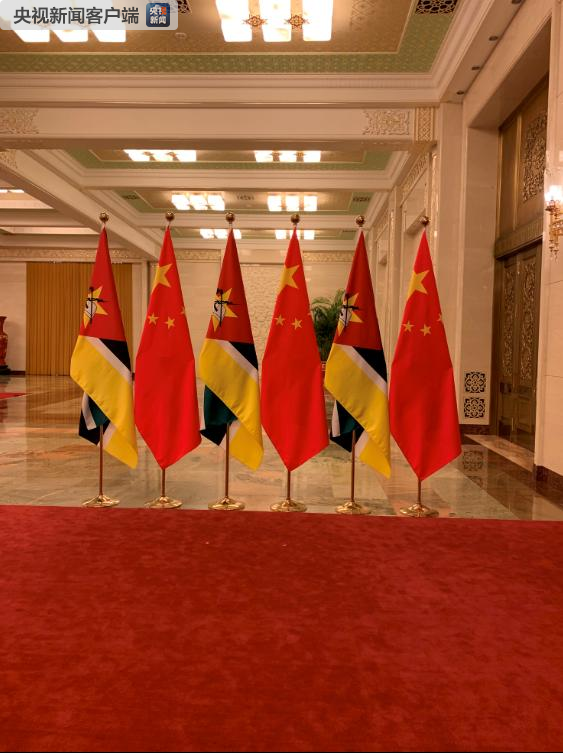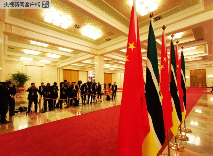 習(xí)近平和莫桑比克總統(tǒng)紐西在人民大會(huì)堂東大廳舉行會(huì)談。(央視記者張曉鵬拍攝)