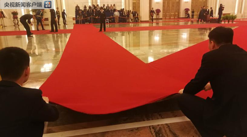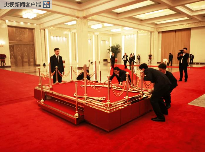 工作人員正在人民大會(huì)堂北大廳搭設(shè)兩國(guó)元首的檢閱臺(tái)。(央視記者張曉鵬拍攝)