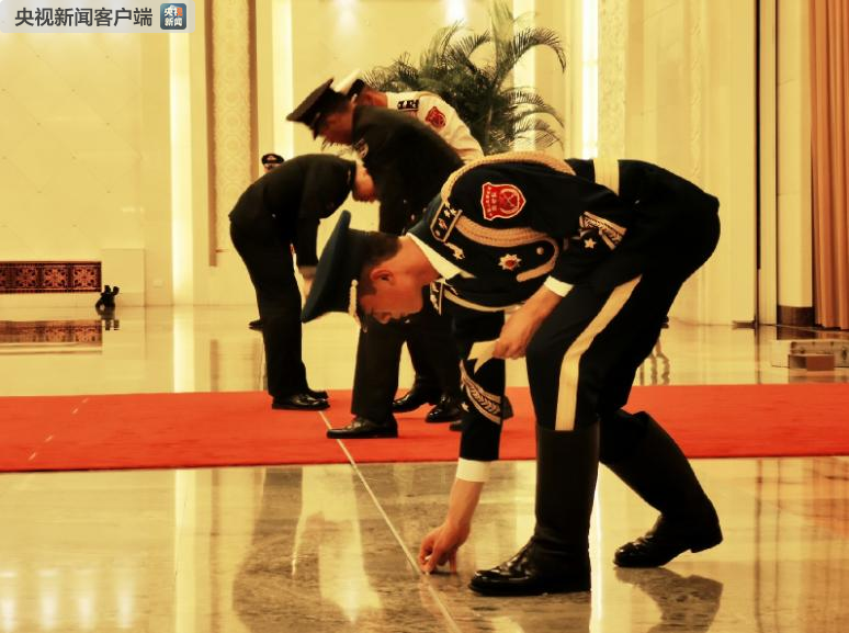 禮兵正在為歡迎儀式貼設(shè)地面標(biāo)識(shí)(央視記者張曉鵬拍攝)