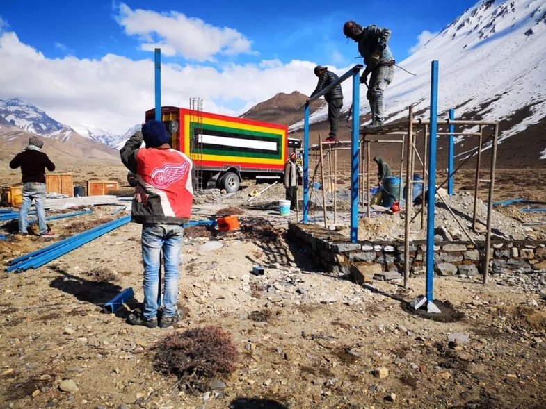 地震臺搭建現(xiàn)場環(huán)境艱苦,身后是皚皚雪山