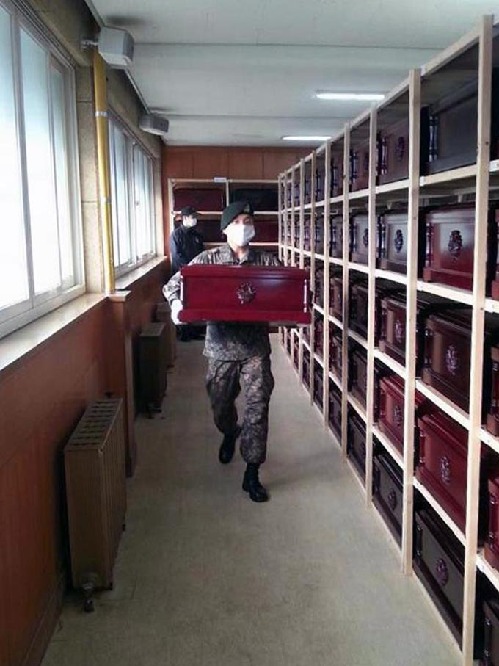 韓方起運儀式開始前,韓軍人將裝有志愿軍遺骸的棺木搬運上車。張 悅攝