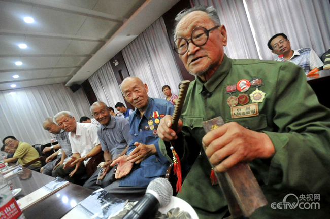 ??? 2013年7月26日,山西運(yùn)城,在“紀(jì)念抗美援朝戰(zhàn)爭勝利60周年座談會”上,79歲的志愿軍老戰(zhàn)士代表段亂亂(前右一)帶病為老戰(zhàn)友和與會代表表演快板《誰是世上最可愛的人——中國人民志愿軍》等段子。