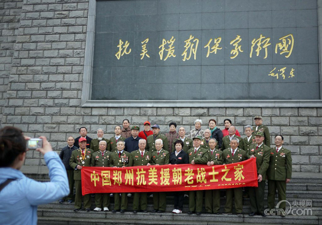 2010年04月12日, 丹東,抗美援朝紀(jì)念館,毛澤東題詞”抗美援朝保家衛(wèi)國”前,老戰(zhàn)士們合影留念。