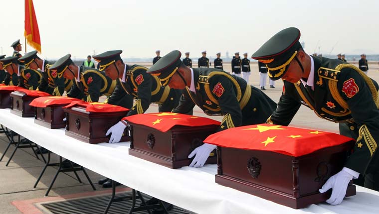 3月31日,在韓國仁川國際機(jī)場(chǎng),中方禮兵為烈士遺骸起靈。
