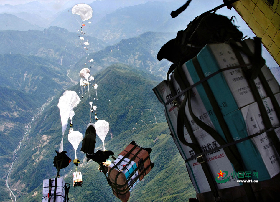 汶川地震發(fā)生后,中國(guó)人民解放軍飛機(jī)向?yàn)?zāi)區(qū)空投了大批救災(zāi)物資,圖中所顯示的是系著降落傘的藥品箱。據(jù)統(tǒng)計(jì),僅2008年5月13日一天,部隊(duì)就組織出動(dòng)22架軍用運(yùn)輸機(jī),調(diào)用民用客機(jī)12架,在惡劣氣候條件下不間斷飛行79架次,成功將1.1萬多名官兵輸送到成都附近的4個(gè)機(jī)場(chǎng)。