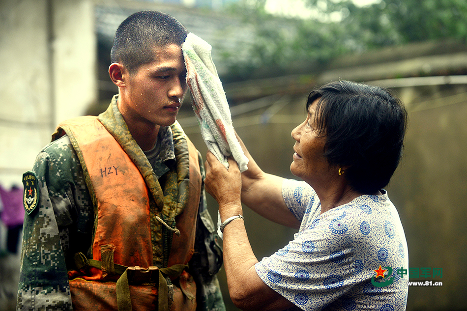 這個(gè)兵叫胡兆洋,是個(gè)列兵,那天是他輾轉(zhuǎn)的第三個(gè)險(xiǎn)情點(diǎn)了,晶橋河芮家圩段?!按蠹倚菹⑾?,等待下一個(gè)通知?!蹦嗨薪萘?個(gè)小時(shí)的他,身上沾滿了泥,休息的路邊有池清水,便上去洗漱。殊不知,角落里有位老奶奶一直默默地盯著他。清理完,剛轉(zhuǎn)身,老媽媽拿著一條熱毛巾,擁上來給他擦汗。那一刻,他們倆只是一個(gè)眼神,“你和我孫子一樣大”,“換地方了,集合”,來不及說上話,便走了。記者記錄下了這個(gè)瞬間,這里代他向那位不相識(shí)奶奶傳個(gè)話“奶奶,我們都是您的好孫子!”殷永達(dá) 宋志成 謝浩攝影報(bào)道