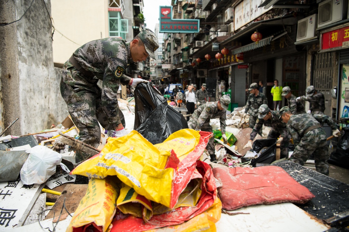 8月25日,解放軍駐澳門部隊官兵在十月初五街一帶參與“天鴿”臺風災后援助工作。新華社記者 張金加 攝
