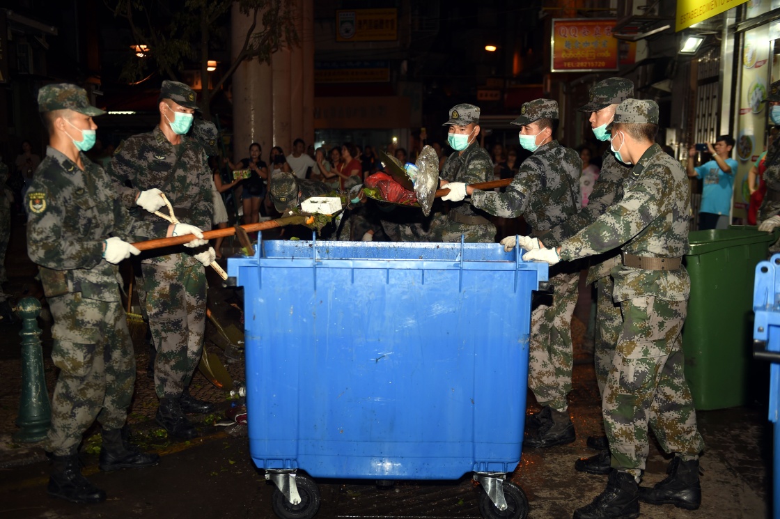 8月25日,駐澳門部隊在澳門高士德區(qū)參與“天鴿”臺風災后援助工作。新華社記者 盧炳輝 攝
