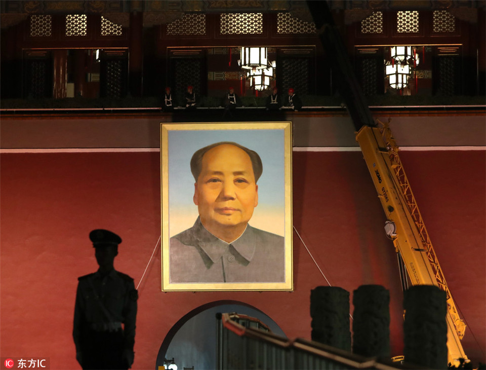迎國慶天安門城樓更換毛主席畫像 游客與新畫像合影留念