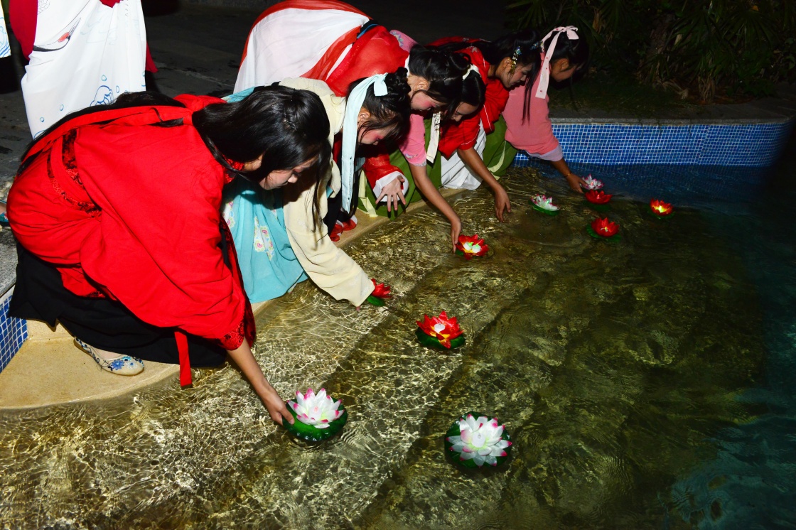 10月4日夜,貴州省劍河縣溫泉城舉辦“中秋拜月”活動(dòng),人們通過漢服走秀、拜月、放水燈等形式,歡度佳節(jié)。這是漢服愛好者在貴州省劍河縣溫泉城放水燈。新華社發(fā)(楊文斌 攝)