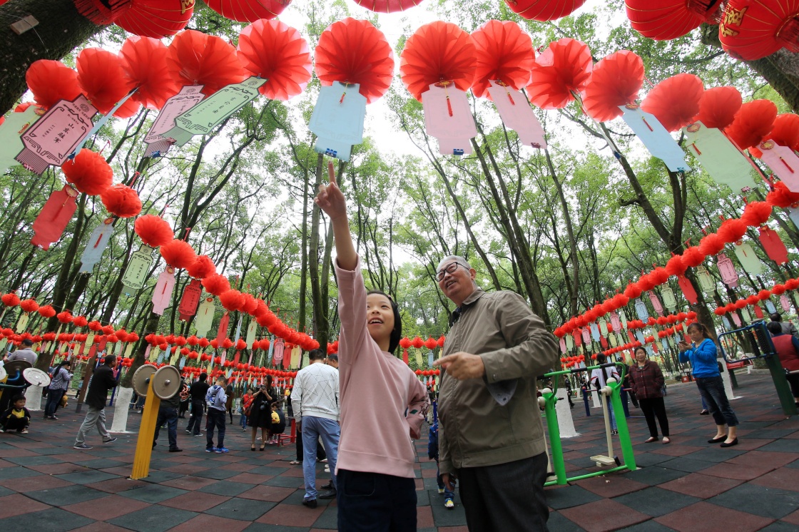 10月4日,湖南省衡陽縣西渡鎮(zhèn)中洲公園開展“猜燈謎·過中秋”活動,上千條各式燈謎吸引了眾多市民爭相競猜。在衡陽縣西渡鎮(zhèn)中洲公園活動現(xiàn)場,一個小朋友與爺爺在討論燈謎謎底。新華社發(fā)(劉欣榮 攝)