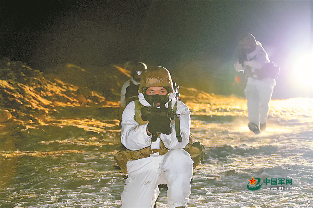 這是北部戰(zhàn)區(qū)陸軍某特戰(zhàn)旅一次帶實戰(zhàn)背景的冬季戰(zhàn)術(shù)偵察演練。晚上,有淡淡的星光,風(fēng)力3級,溫度降至-25℃。