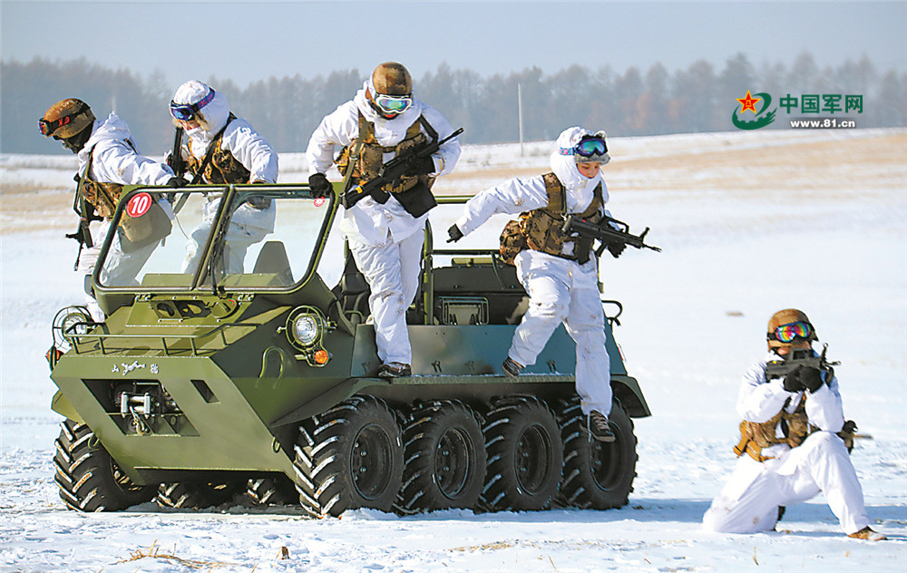 特戰(zhàn)女兵乘坐全地形突擊車,與特戰(zhàn)分隊合圍“敵人”。