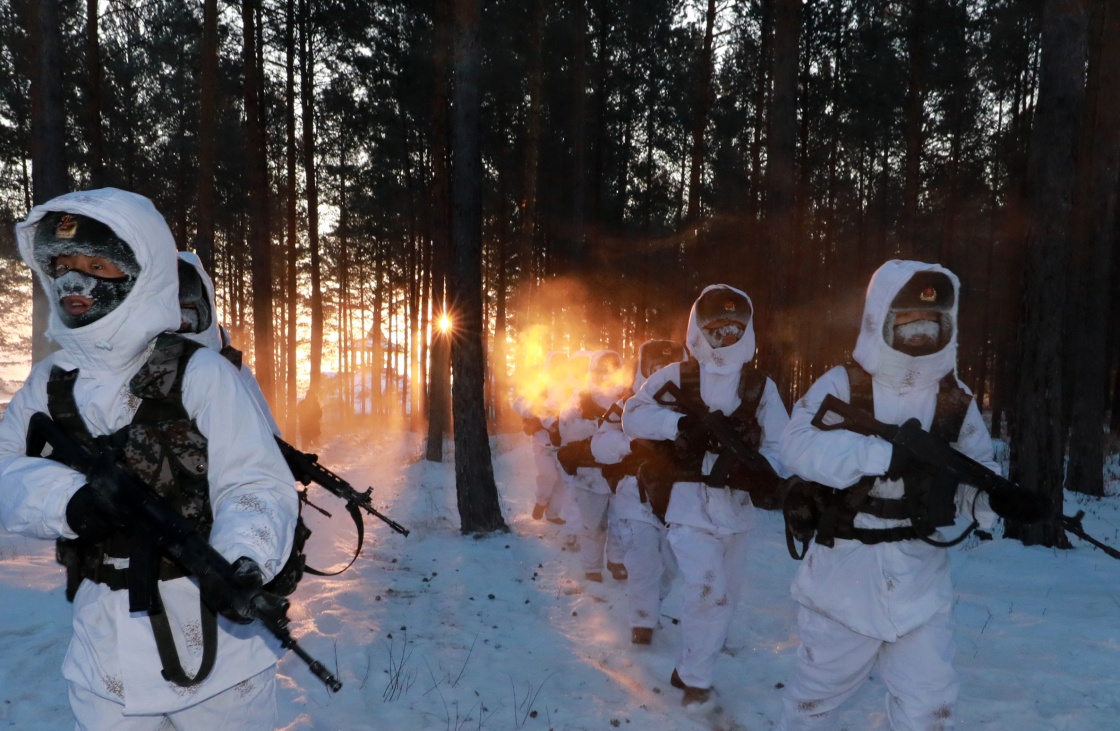 駐守在漠河縣北極村的北部戰(zhàn)區(qū)陸軍某部官兵巡邏間隙展開訓(xùn)練(2月5日攝)。