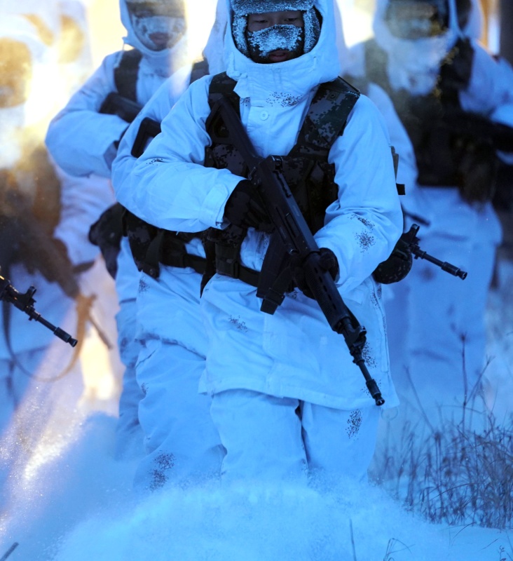 駐守在漠河縣北極村的北部戰(zhàn)區(qū)陸軍某部官兵巡邏間隙展開(kāi)訓(xùn)練(2月5日攝)。