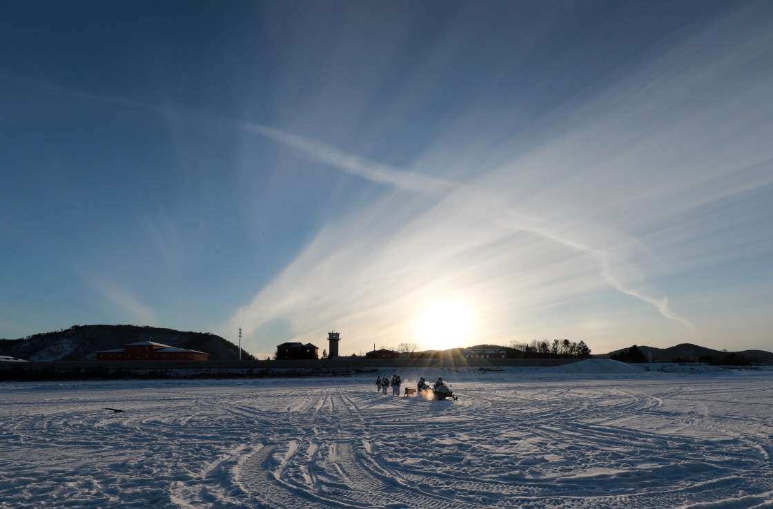 駐守在漠河縣北極村的北部戰(zhàn)區(qū)陸軍某部官兵在江面巡邏(2月5日攝)。