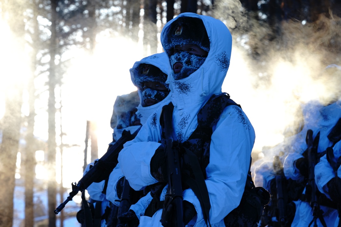 駐守在漠河縣北極村的北部戰(zhàn)區(qū)陸軍某部官兵巡邏間隙展開訓(xùn)練(2月5日攝)。