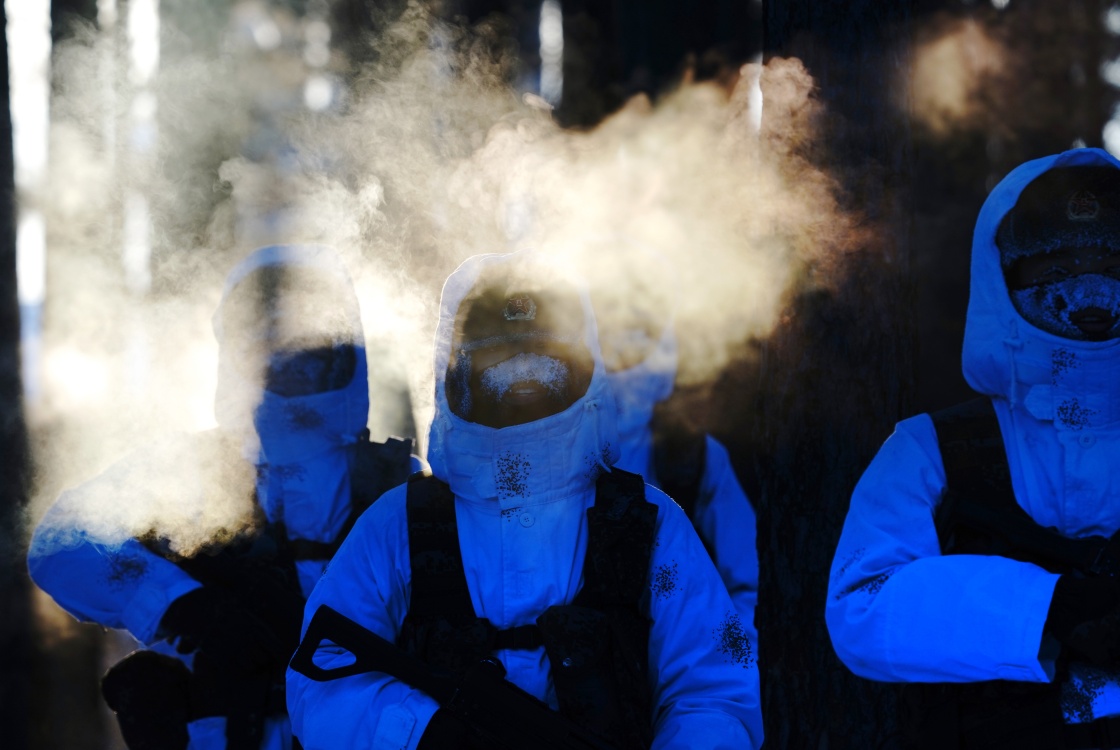 駐守在漠河縣北極村的北部戰(zhàn)區(qū)陸軍某部官兵巡邏間隙展開訓(xùn)練(2月5日攝)。